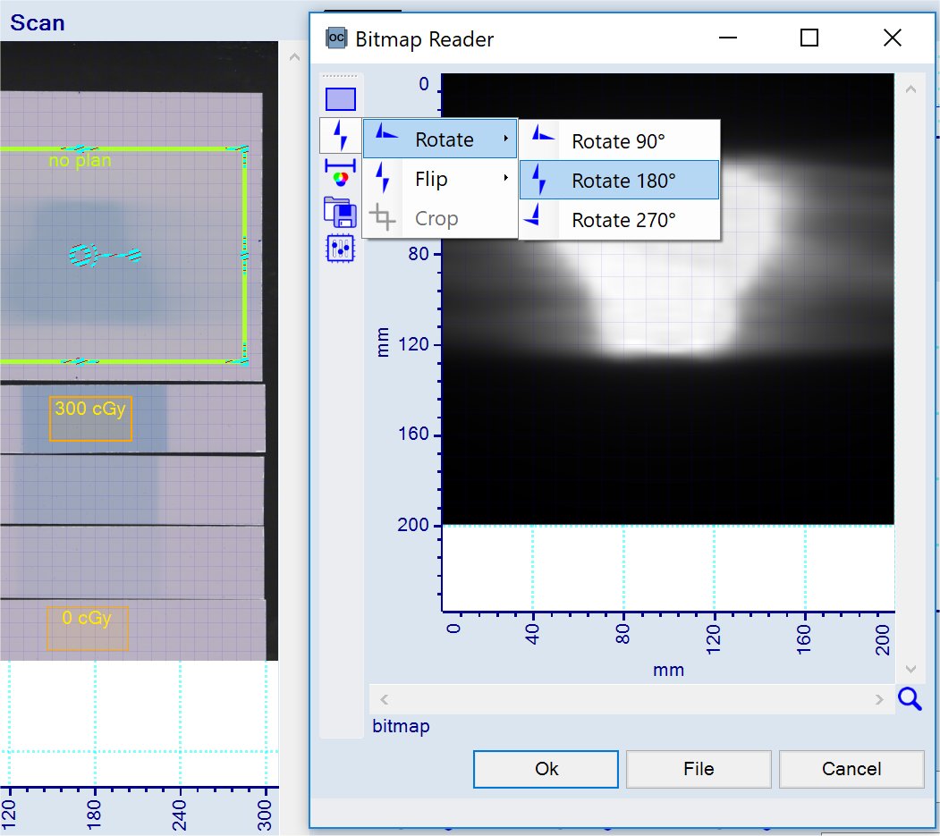 Note: The plan image needs to be rotated by 180° as shown below. Any quadrant adjustment (rotation, flipping), dose range scaling or cropping can be carried out in the 'Bitmap Reader' panel.