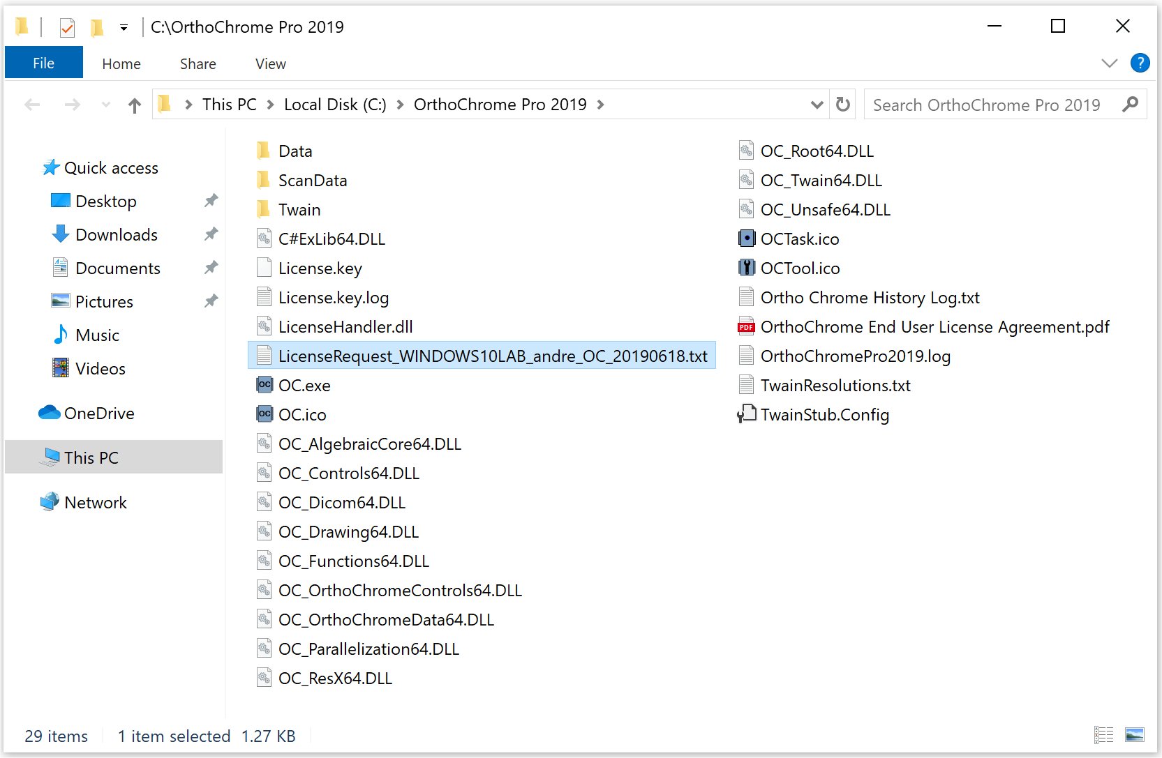 OrthoChrome starts automatically the Windows File Explorer and selects the license request file 'LicenseRequest_xxx.txt' (file extension might be hidden depending on the setting of your file browser).