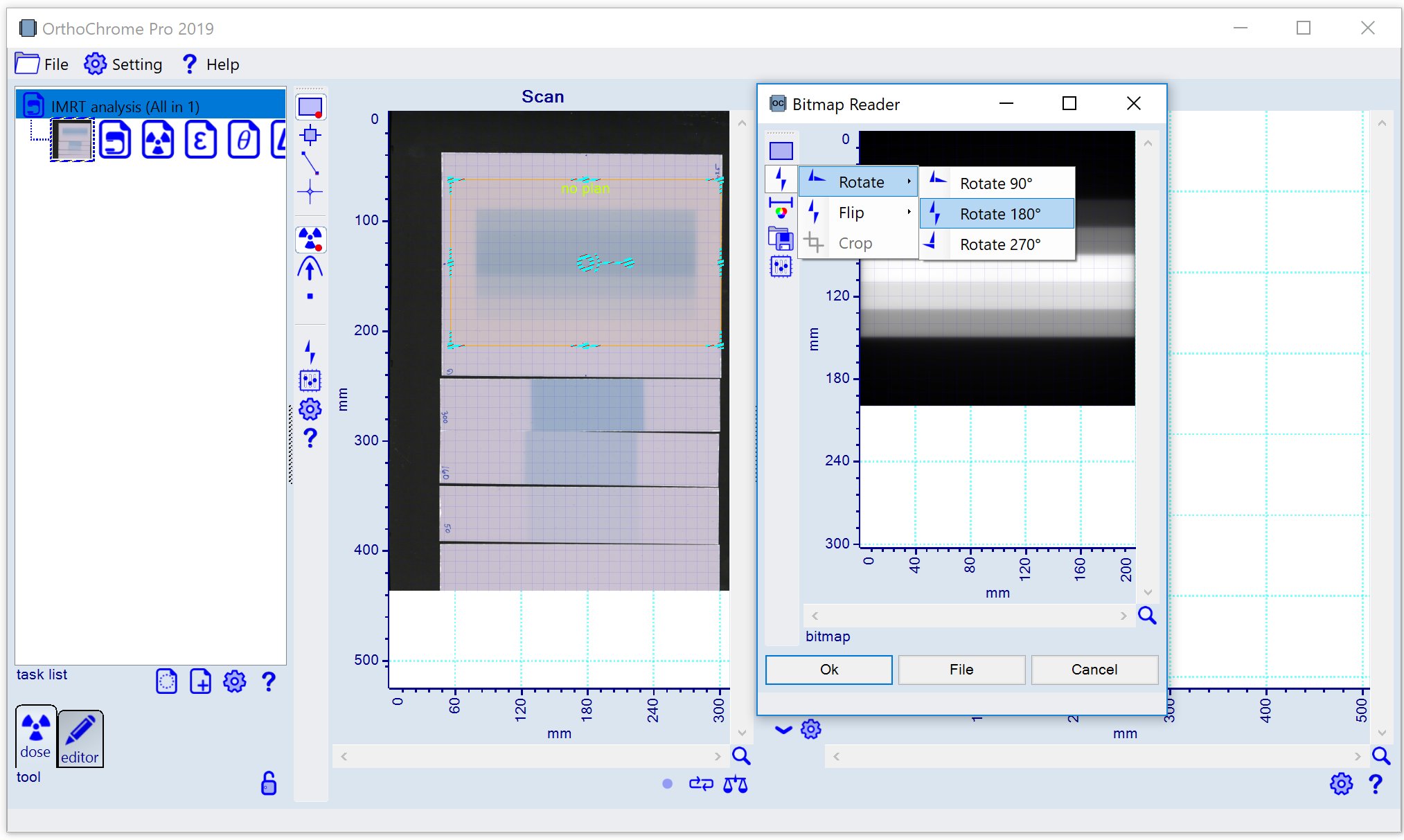 Note: The plan image needs to be rotated by 180° as shown below. Any quadrant adjustment (rotation, flipping), dose range scaling or cropping can be carried out in the 'Bitmap Reader' panel.