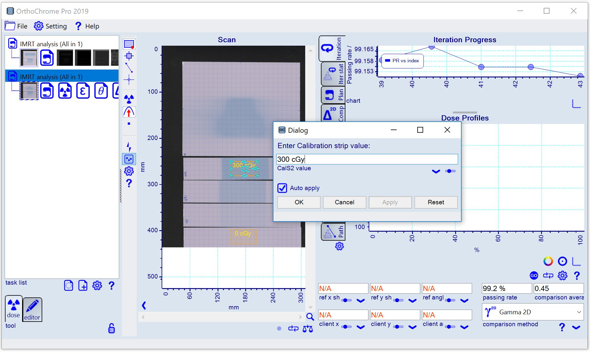 and draw frame for film strip to marke the calibration area. When the frame is selected a dialog panel to input the calibration dose value as shown below.