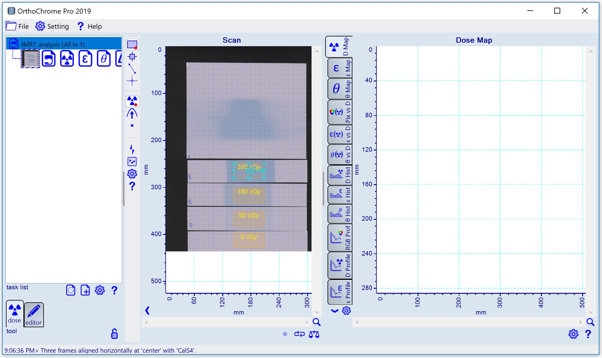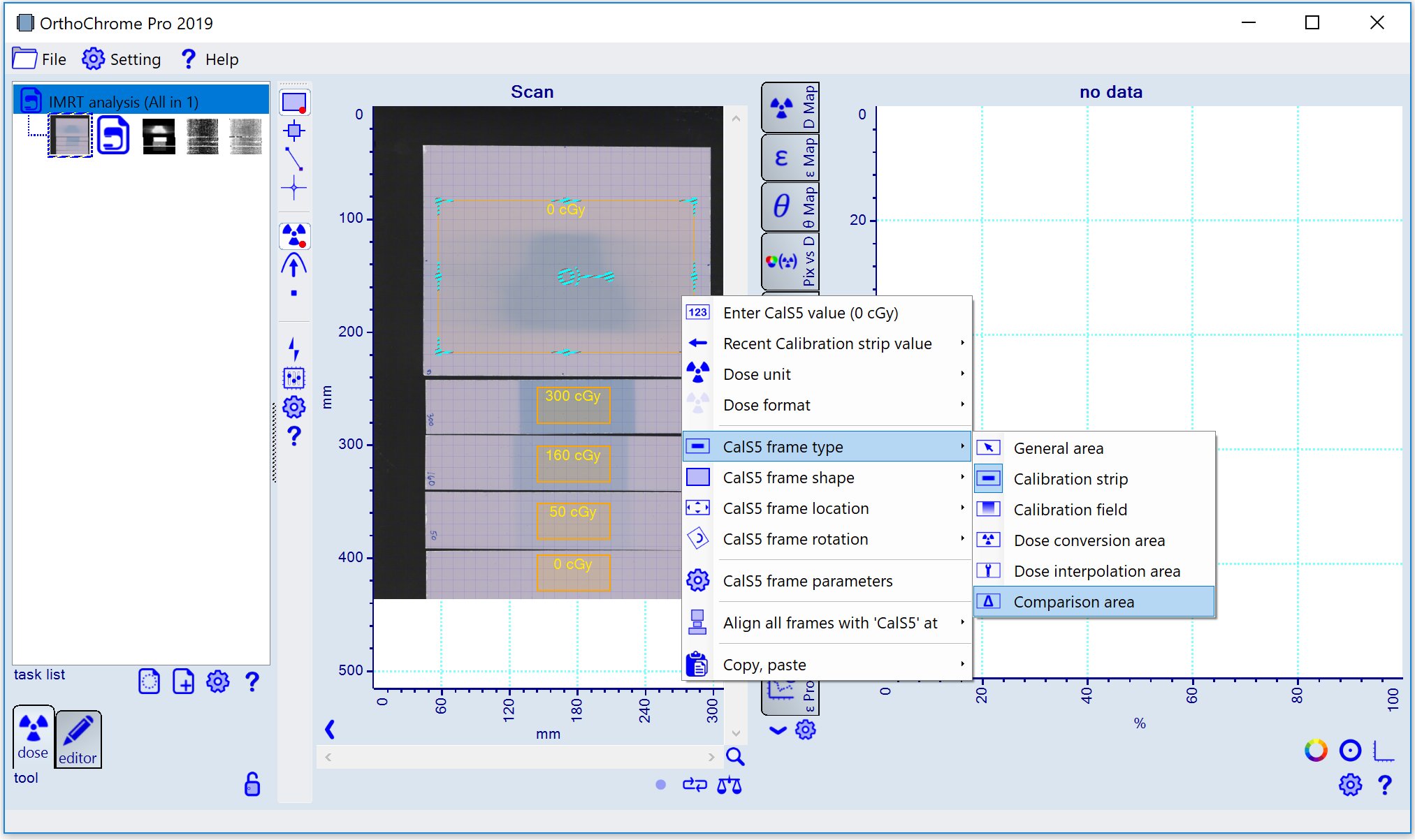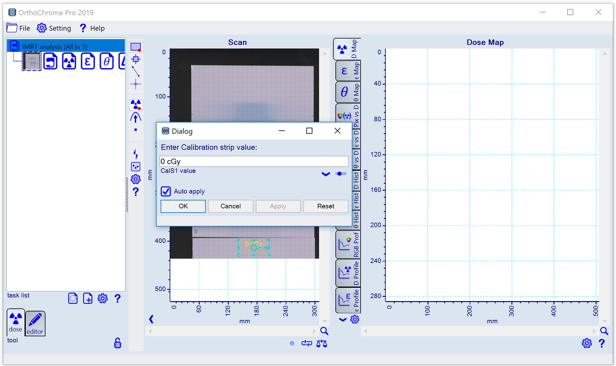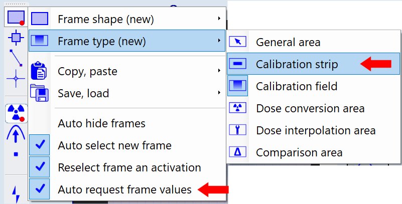 and draw frame for film strip to marke the calibration area. When the frame is selected a dialog panel to input the calibration dose value as shown below.