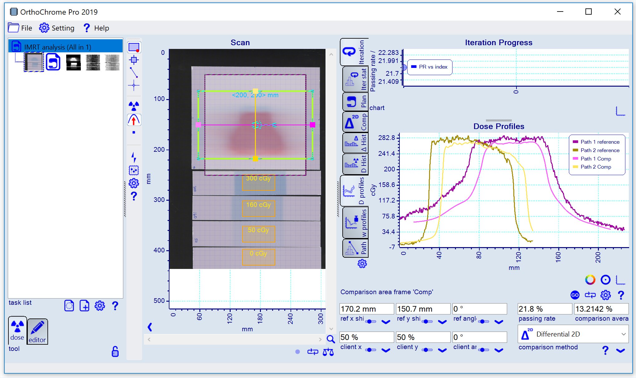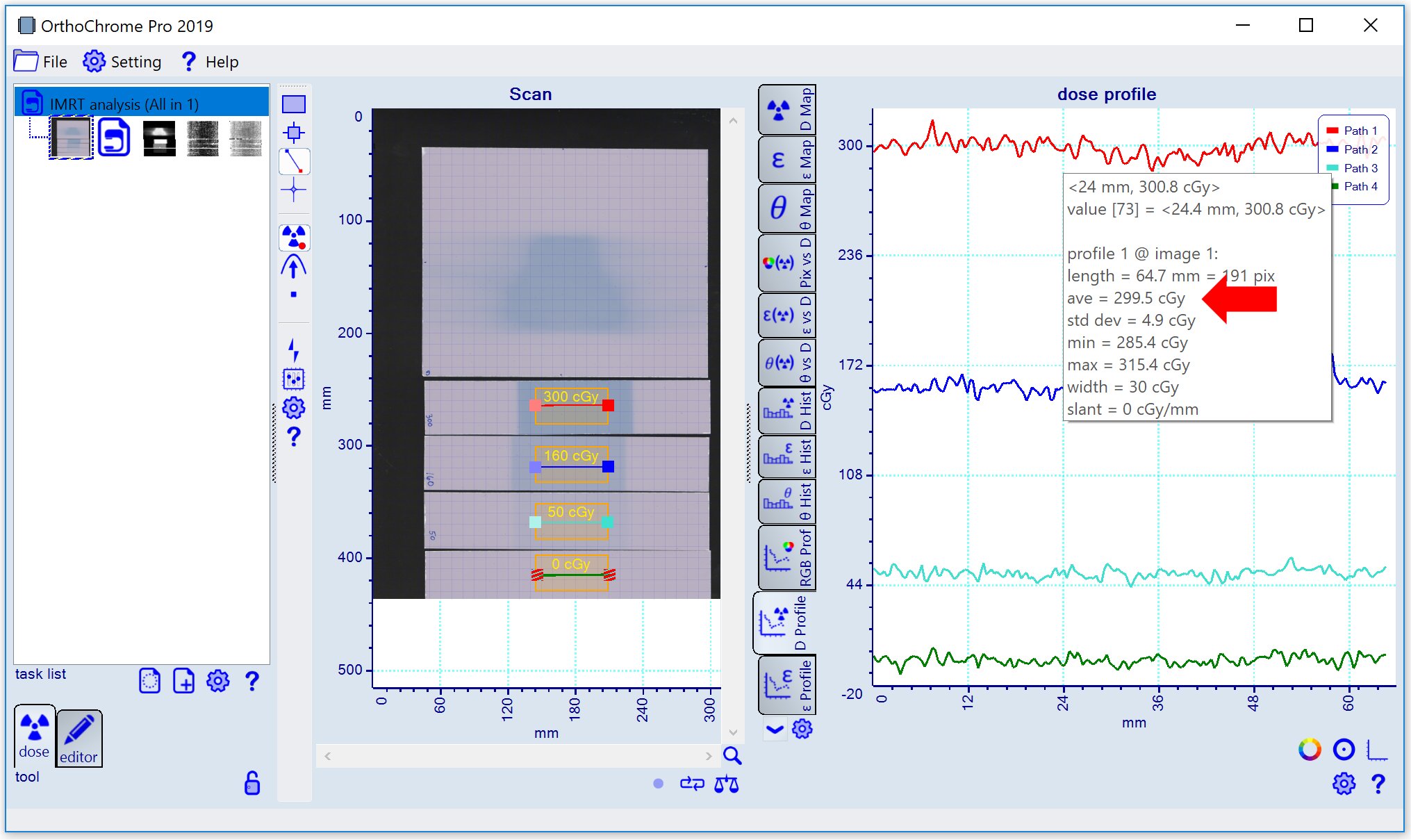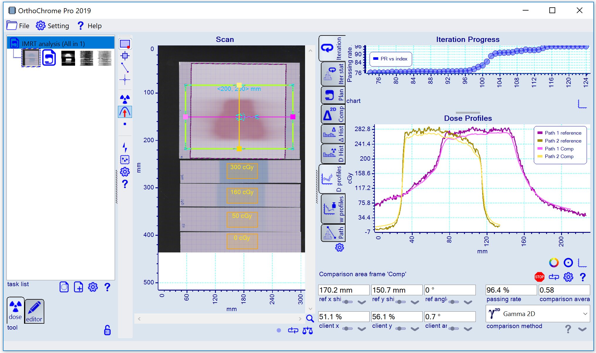 Purpose: Complete IMRT analysis with calibration, dose mapping and plan comparison. This example is based on calibration strips exposed to flat fields at several dose levels.